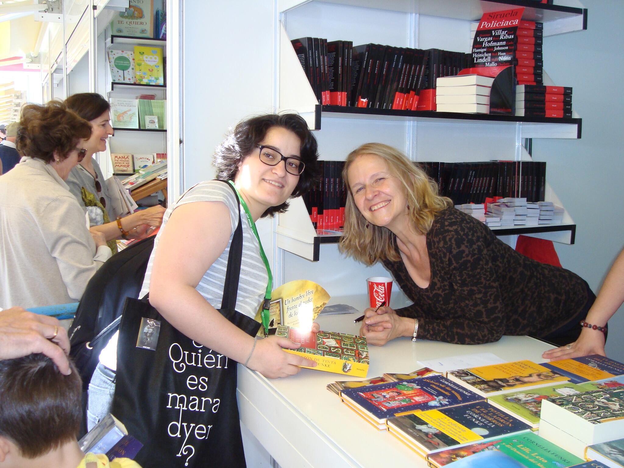 Tras unos cuantos paseos por la Feria, nos repartimos para acudir a las distintas firmas. Me hubiese encantado ir a la de Laura Gallego, pero la cola que había era imposible y eso que era temprano. Así pues, junto a Ithil me dirigí a la caseta donde estaba Cornelia Funke. En la espera conocí a Aererion y más personas, con lo cual se hizo más ameno.